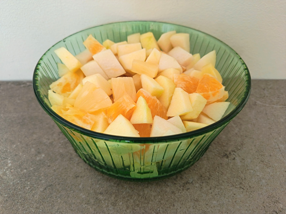 1. Kuori omena, päärynä ja appelsiini. Poista omenasta ja päärynästä siemenkota. Pilko hedelmät paloiksi.