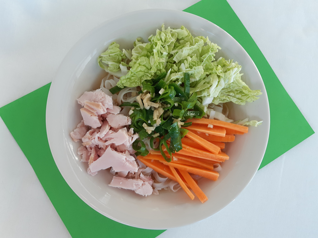 6. Kokoa aineksia syviin annoskulhoihin. Kaada liemi päälle juuri ennen tarjoilua.