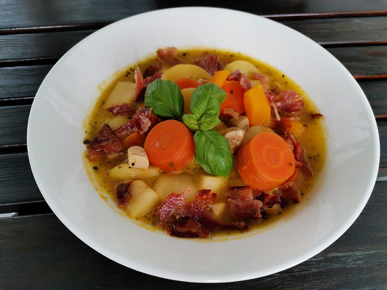 Lämpöinen kanakeitto pekonimurulla. Käytä ruokavalioon sopivia kasviksia ja mausteita. Keittoreseptiä on helppo muunnella erilaisia rajoitteita huomioivaksi.