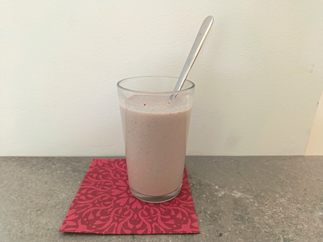 Tämä nopea smoothie on valmista hetkessä. Työvälineiksi tarvitset vain juomalasin ja lusikan. Smoothie on parhaimmillaan kylmänä. Jos maito sopii ruokavalioon, voit valmistaa smoothien maidosta.