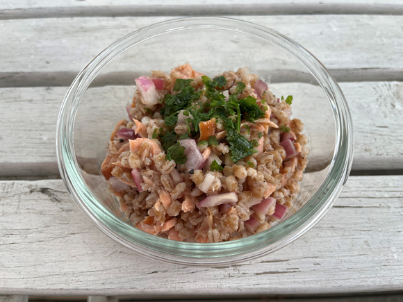 Herkullinen ja täyttävä salaatti valmistuu keitetyistä ohrasuurimoista ja savulohesta. Voit käyttää salaattiin mitä vain kypsää ja suolattua kalaa. Jos tarvitset gluteenittoman salaatin, vaihda ohran tilalle tattari- tai kvinoasuurimoita.