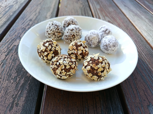 Suklaapallot ovat nopeita valmistaa ja herkullisia naposteltavia. Voit käyttää kauran sijaan myös toista ruokavalioon sopivaa hiutaletta. Voit pyöritellä pallot myös kookoshiutaleissa tai tomusokerissa, niin kuin kuvassa.