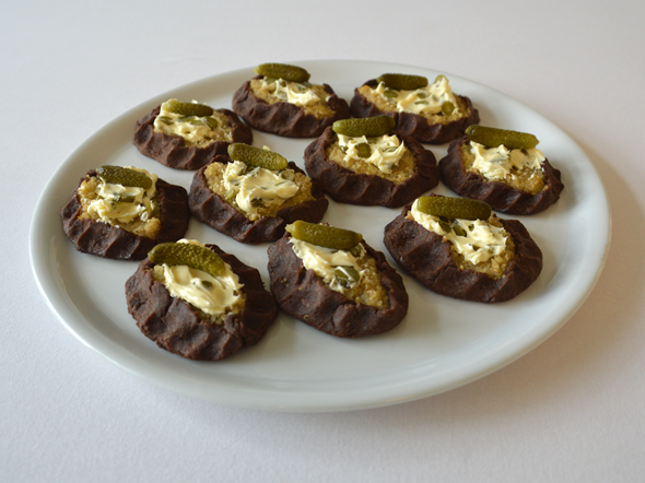 8. Pehmitä rasva kulhossa sekoitellen. Hienonna puolet kurkuista ja sekoita rasvaan. Levitä täyte jäähtyneille piirakoille. Koristele lopuilla suolakurkuilla.