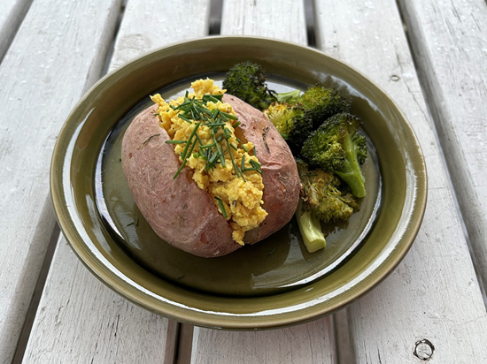 3. Avaa kuumiin perunoihin veitsellä vako. Täytä hummuksella.