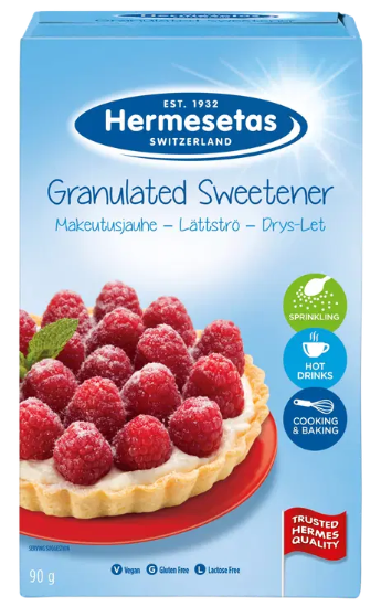 Hermesetas makeutusjauhe on jauhemainen makeuttaja, joka kestää kuumentamisen ja on ihanteellinen ruoanlaittoon ja leivontaan. Jauhemaisen koostumuksen ansiosta se liukenee helposti nesteisiin ja muihin seoksiin ja sitä voi ripotella ruoan, marjojen tai esim. murojen päälle. Käytä kuten tomusokeria. Saat mukavan neutraalin makeutuksen. Teelusikallisessa on alle 2 kcal. Vegaaninen, gluteeniton ja laktoositon.