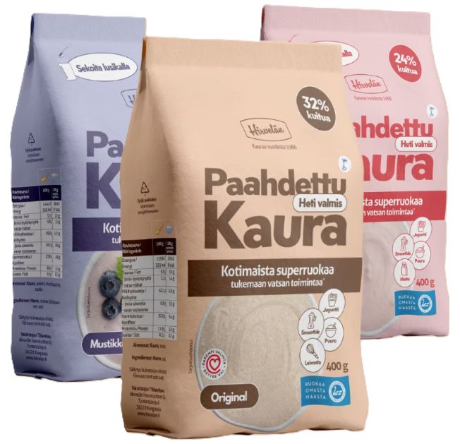 Hirvelän Paahdettu kaura on saatavana maustamattomana. Mustikassa ja mansikassa maku tulee kotimaisesta sokerista sekä aidosta marjajauheesta.